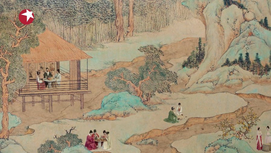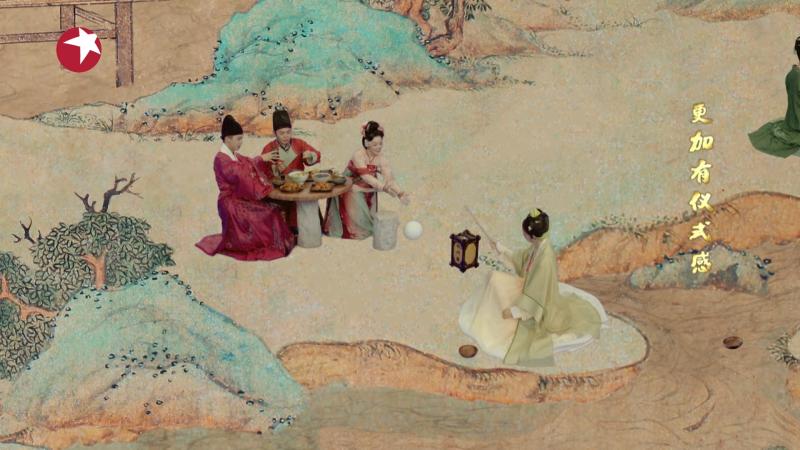 5分多鐘的節目,從中華藝術宮頂層的錄製現場開始。錄製在即,參與演出的彩虹合唱團卻不見了蹤影,原來,全團都“穿越”到一幅山水畫卷中了。古畫中,曲水流觴,身穿古裝的彩虹合唱團,爭論起月餅的文化史。一首《食在中秋》,唱出了月餅的七種吃法,不僅能“拌着吃”“炒着吃”,還能“煎着吃”“炸着吃”。
