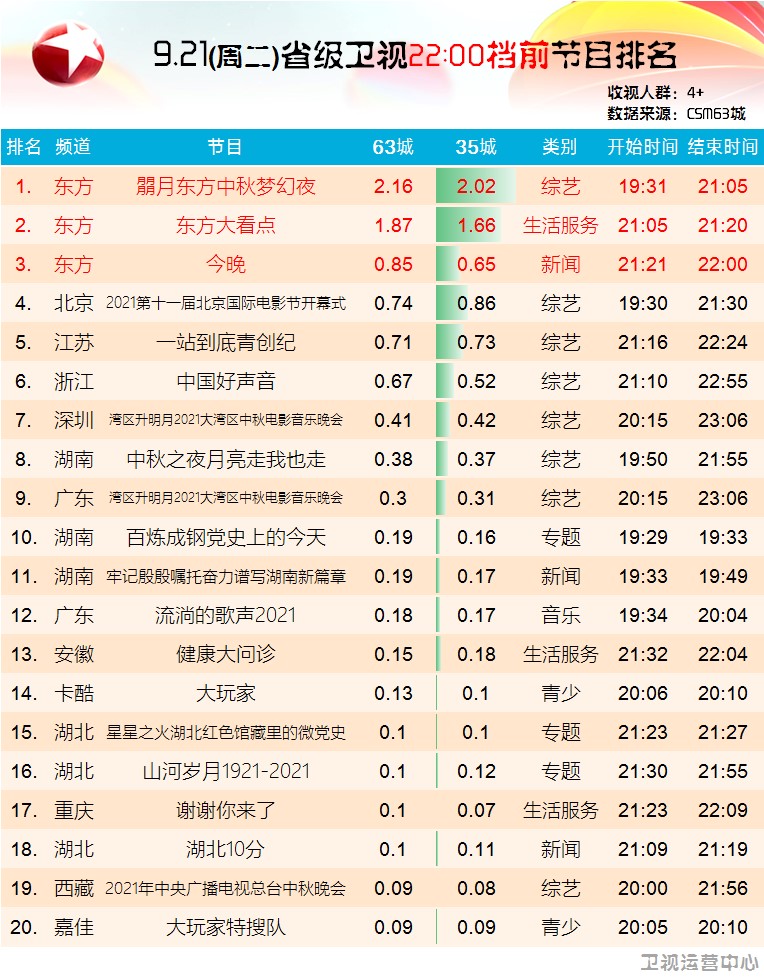 各網的收視均取得了排名第一優異的成績,其中在CSM63城和CSM35城中收視雙雙破2,成為唯一一檔“衞視秋晚”破2的晚會,收視分別是河南中秋晚會的216倍,湖南中秋晚會的5.7倍。同時晚會在年輕人羣中收視破圈,00後收視份額超過12%。