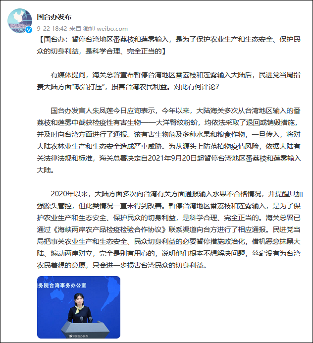 國台辦發言人朱鳳蓮9月22日應詢表示,今年以來,大陸海關多次從台灣地區輸入的番荔枝和蓮霧中截獲檢疫性有害生物——大洋臀紋粉蚧,均依法採取了退回或銷燬措施,並及時向台灣方面進行了通報。該有害生物危及多種水果和糧食作物,一旦傳入,將對大陸農林業生產和生態安全造成嚴重威脅。為從源頭上防範植物疫情風險,依據大陸有關法律法規和標準,海關總署決定自2021年9月20日起暫停台灣地區番荔枝和蓮霧輸入大陸。