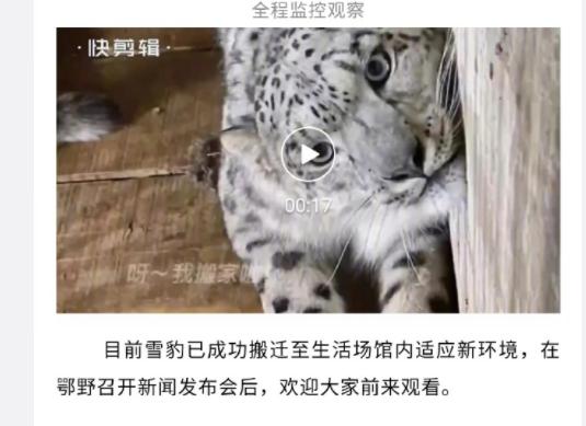 該文章最後一段提及,“目前雪豹已成功搬遷至生活場館內適應新環境,在鄂野召開新聞發佈會後,歡迎大家前來觀看”。