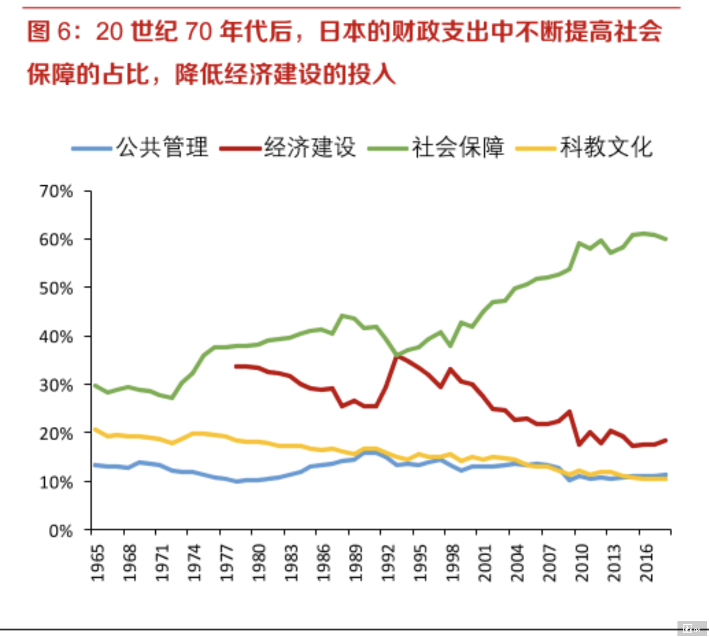 有觀點認為,在貨幣超發而信貸需求低迷的背景下,日本經濟長期低通脹、低增長,與財政支出減少經濟建設投資、擴大社會保障支出直接相關,根源上是老齡化及產業轉移導致的。