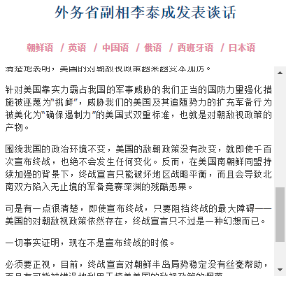李泰成還稱:“必須要正視,目前,終戰宣言對朝鮮半島局勢穩定沒有絲毫幫助,而且有可能被錯誤地利用於掩蓋美國的敵視政策的煙幕。我們已正式闡明過這種立場,終戰宣言不是賜給誰的‘禮品’,而有可能根據局勢變化會隨時變成一張廢紙。撤銷美國的雙重標準和對朝敵視政策是保障朝鮮半島局勢穩定與和平的最優先課題。”