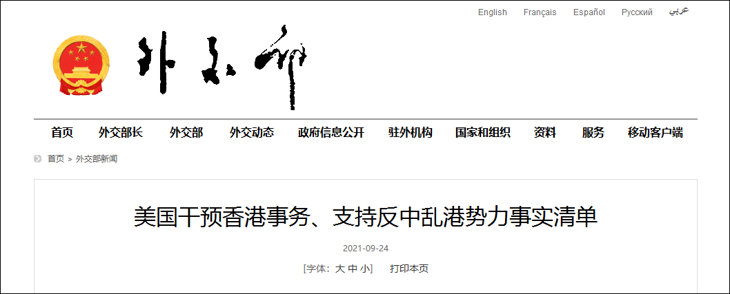 據外交部網站9月24日消息,外交部發布“美國干預香港事務、支持反中亂港勢力事實清單”,內容如下: