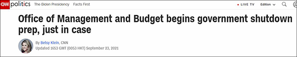 CNN23日的報道稱,“如果國會方面在9月30日前還沒有通過額外預算撥款的提案,那麼美國政府的停擺只是‘時間問題’。