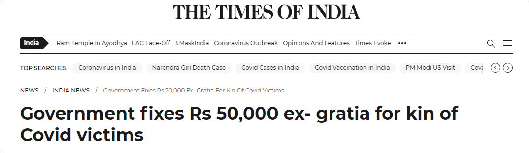 據《印度快報》報道,印度政府是在高等法院的敦促下做出上述決定的,6月30日,印度最高法院因聽取兩位律師建議幫助“陷入經濟困擾的新冠死者家庭”度過難關的請願後,要求國家人權法院考慮為新冠死者家庭提供經濟補償。對此,9月11日,印度相關部門回應了最高法的要求,出台了指導方針,決定由國家救災基金向新冠死者家庭提供這筆補償款項。方針還提到,新冠患者在確診後30天內自殺,也可被定性為“新冠疫情死亡者”,可以獲得賠償金。
