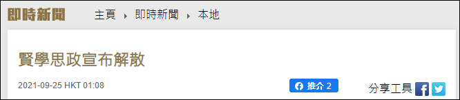 (觀察者網訊)據香港電台網站9月25日消息,亂港組織“賢學思政”9月24日宣佈解散。“賢學思政”於其社交媒體賬號表示,該組織現時已再無運作空間,宣佈正式解散,即日起遣散所有成員及義工,並停止一切事務。