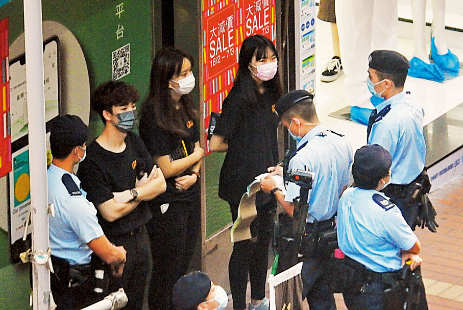 今年2月21日,“賢學思政”3名成員(黑衣人左至右)王逸戰、黃沅琳及朱慧盈在旺角街站被警員調查。圖自香港文匯網