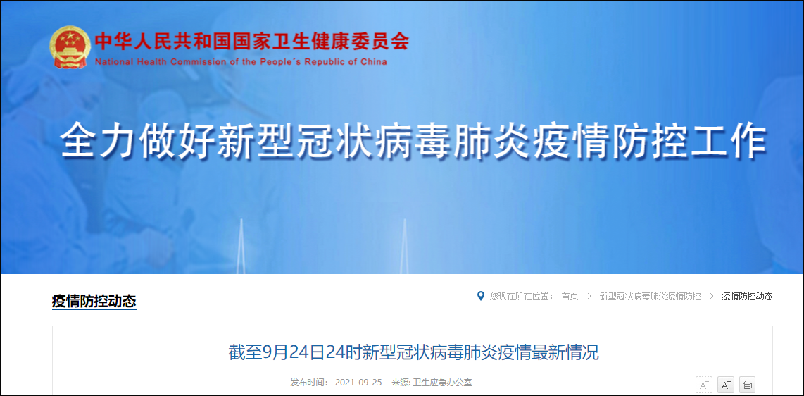 國家衞健委網站9月25日消息,9月24日0—24時,31個省(自治區、直轄市)和新疆生產建設兵團報告新增確診病例38例。其中境外輸入病例28例(廣東9例,雲南7例,上海6例,北京1例,天津1例,遼寧1例,福建1例,湖北1例,廣西1例);本土病例10例(黑龍江8例,均在哈爾濱市;福建2例,其中莆田市1例、廈門市1例)。無新增死亡病例。新增疑似病例2例,均為境外輸入病例(均在上海)。