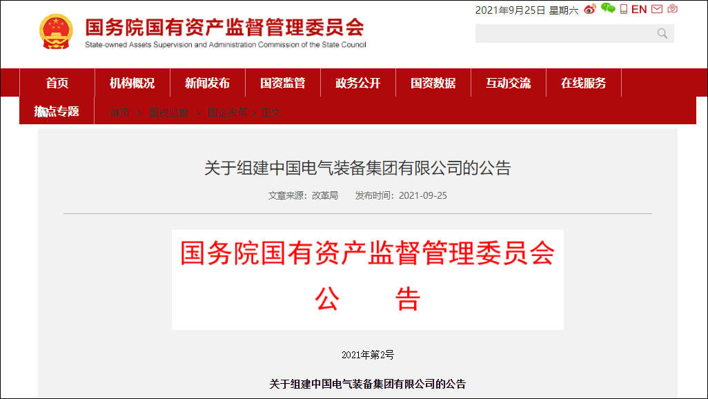 國資委:組建中國電氣裝備集團有限公司