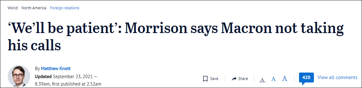 澳媒23日就曾報道稱,澳總理莫里森承認,馬克龍現在不接他的電話,而且可能在一段時間內都不會接。