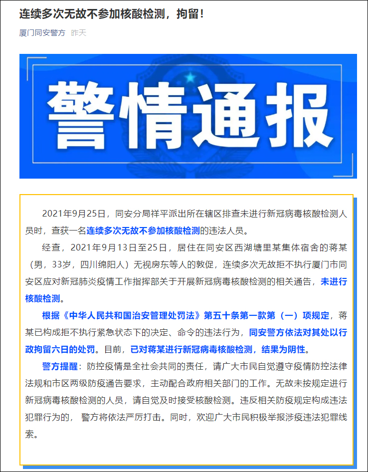 廈門一男子連續多次無故不參加核酸檢測,警方:行拘6日