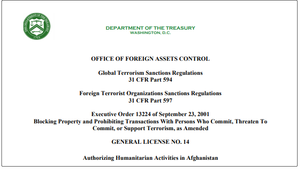 就阿富汗援助問題頒發了兩項通用許可證。來源:美國財政部截圖