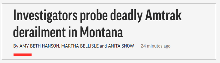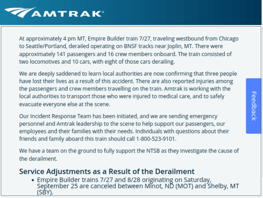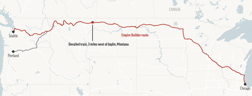 目前,美國國家鐵路客運公司(Amtrak),NTSB和BNSF鐵路相關負責人已到達事故現場,脱軌事故現場位於海倫娜(Helena)約241公里處,距離加拿大邊境約48公里。