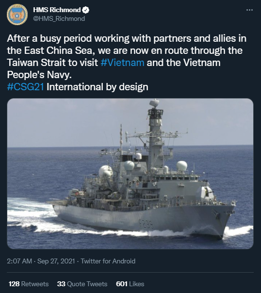 27日上午,英國“伊麗莎白女王”號航母編隊中的護衞艦“里士滿”號獨自穿行台灣海峽,並且於官方推特上發文“炫耀”稱,“正在通過台灣海峽”,將訪問越南和越南人民海軍。