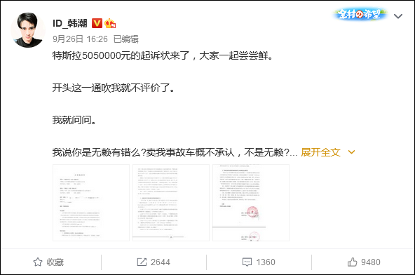 9月26日,韓潮在個人微博發文稱,特斯拉在此前案件中一審敗訴和二審敗訴後,近期又將自己告上了法庭,合計索賠505萬元。