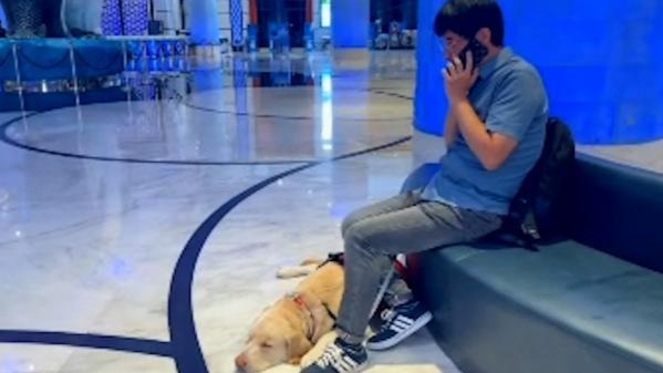 楊先生與導盲犬。截圖自澎湃新聞視頻