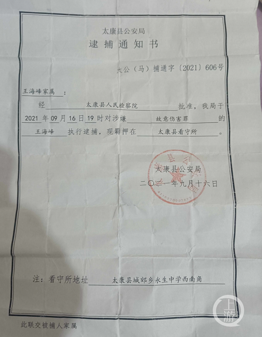 9月26日,河南省周口市太康縣馬頭鎮派出所內,楊莊小學校長王海峯的家屬領到了逮捕通知書,嘆氣説:“太窩火了。”