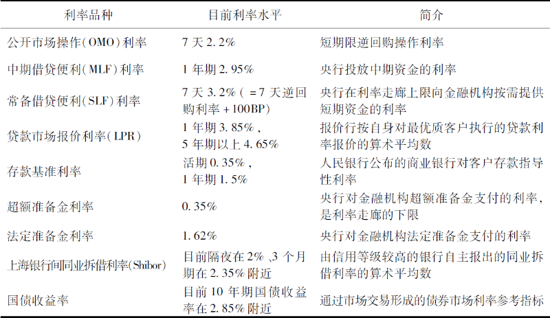 **(一)公開市場操作(OMO)利率與利率走廊。**公開市場操作7天期逆回購利率是央行短期政策利率,目前利率水平為2.2%。央行通過每日開展公開市場操作,保持銀行體系流動性合理充裕,持續釋放短期政策利率信號,使存款類金融機構質押式回購利率(DR)等短期市場利率圍繞政策利率為中樞波動,並向其他市場利率傳導。同時,通過以常備借貸便利(SLF)利率為上限、超額準備金利率為下限的利率走廊的輔助,將短期利率的波動限制在合理範圍。其中,SLF是央行按需向金融機構提供短期資金的工具,由於金融機構可按SLF利率從央行獲得資金,就不必以高於SLF利率的價格從市場融入資金,因此SLF利率可視為利率走廊的上限。目前7天期SLF利率為3.2%,也就是7天期公開市場逆回購利率加100個基點。近期,人民銀行推動SLF電子化操作方式改革,有序實現全流程電子化,有利於提高操作效率,穩定市場預期,增強銀行體系流動性的穩定性,維護貨幣市場利率平穩運行,有效防範流動性風險。超額準備金利率是央行對金融機構存放在央行的超額準備金付息的利率,由於金融機構總是可以將剩餘資金放入超額準備金賬户,並獲得超額準備金利率,就不會有機構願意以低於超額準備金利率的價格向市場融出資金,因此超額準備金利率可視為利率走廊的下限。目前超額準備金利率為0.35%。