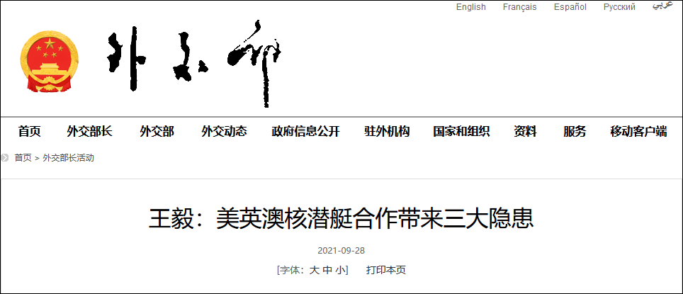 王毅表示,美國、英國與澳大利亞結成三方安全夥伴關係並計劃開展核潛艇合作,國際社會特別是亞太國家高度關注和警惕,多國表達關切和質疑。中方認為,此舉對地區和平穩定和國際秩序帶來三大隱患: