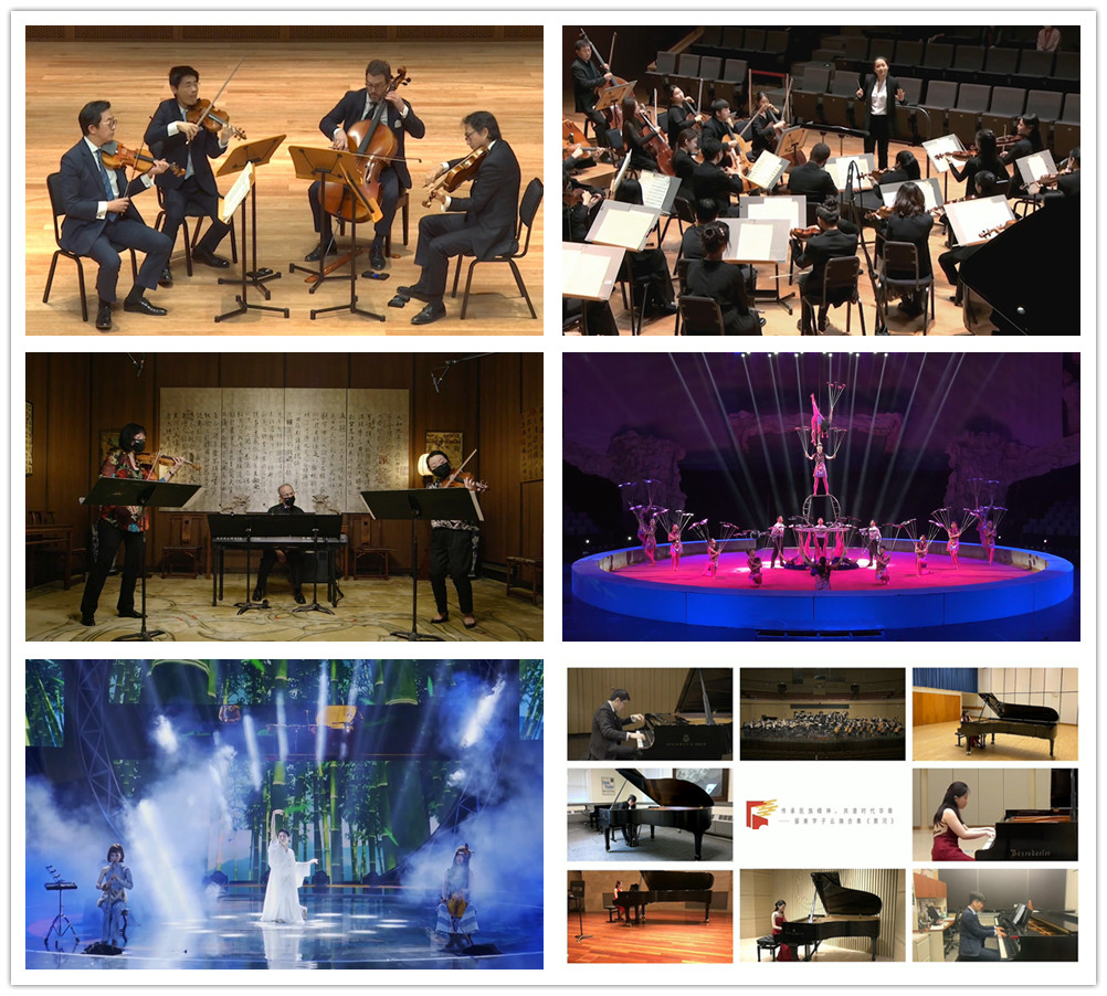 在秦剛大使和美方嘉賓致辭後,中美藝術家攜手獻上了一場精彩紛呈的演出:天津茱莉亞學院和紐約茱莉亞學院師生共同演繹了《貝多芬絃樂四重奏》及《良宵》;美國國家交響樂團音樂家狄安娜·李·比恩、利安德·比恩、喬靜演奏了由美籍華裔作曲家陳怡所作的小提琴與鋼琴合奏曲《浪漫曲與舞曲》;中國留美學子及長沙交響樂團雲端合奏鋼琴協奏曲《黃河》第四樂章《保衞黃河》;山東雜技團代表作之一《轉碟》以及廣東衞視《國樂大典3》節目優秀作品《卧虎藏龍》。招待會在全國各地慶祝建黨百年燈光秀和《歌唱祖國》的旋律中圓滿落下帷幕。