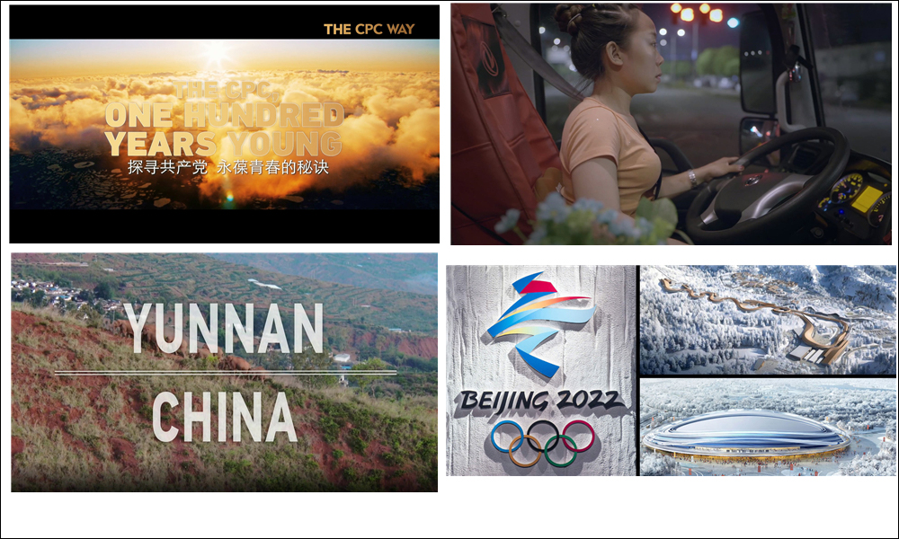 國慶視頻展映:從上至下、從左至右依次為《活力密碼》、《柴米油鹽之上》、《與大象同行》、北京2022冬奧會籌備視頻集錦
