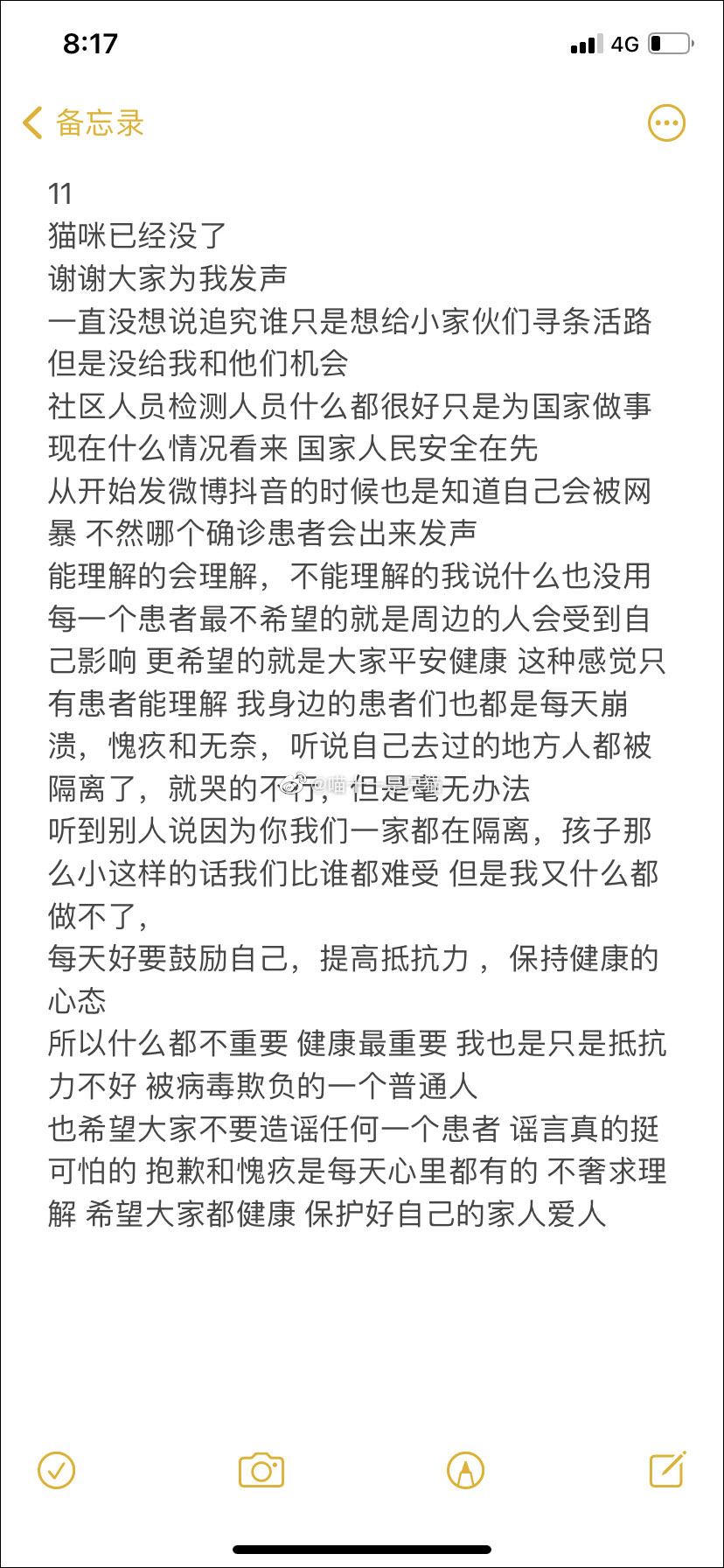 最後,患者呼籲大家不要造謠任何一個患者。自己會每天鼓勵自己提高抵抗力,保持健康的心態。