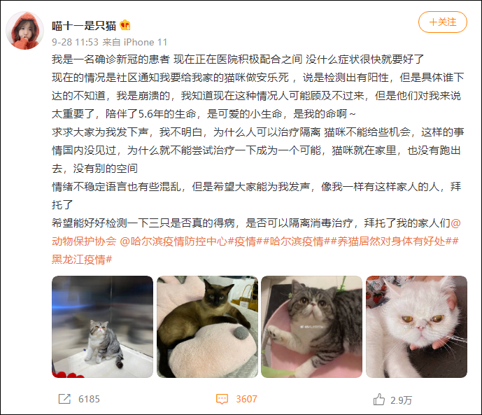(觀察者網訊)9月28日,哈爾濱南崗區確診病例在微博發聲稱,27 日,社區工作人員通知她,她留在家中的 3 只貓因核酸檢測呈陽性,需進行安樂死。患者向網友求助,希望給貓爭取一個救治的機會。