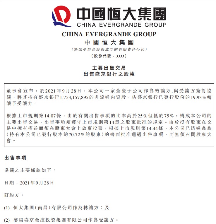 根據公告,恒大董事會宣佈:“於9月28日,本公司一家全資子公司作為轉讓方,與受讓方簽訂協議,將其持有盛京銀行1,753,157,895的非流通內資股,佔盛京銀行已發行股份的19.93%轉讓予受讓方。”