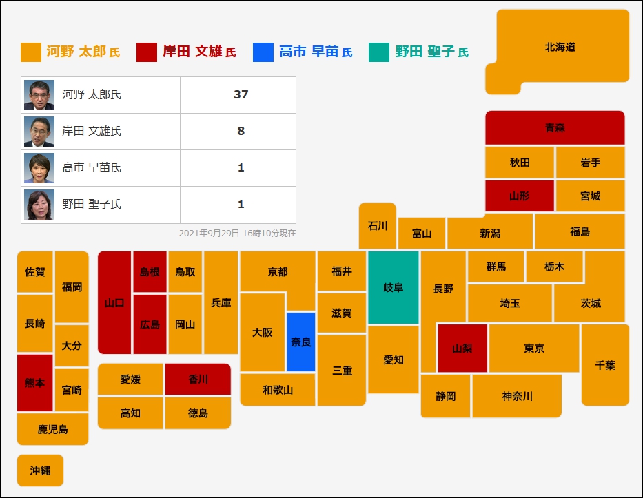 在第一輪投票的黨員票部分,河野共獲得169票,居首位;岸田110票;高市74票;野田29票。根據日本廣播協會(NHK)網站數據,河野獲得的黨員實際投票數為335046,得票率44.1%;岸田獲219338票,得票率28.9%;高市獲147762票,得票率19.4%;野田獲57927票,得票率7.6%。日本47個都道府縣中,河野在37個的得票率居首位。其中28個領先第二名在10%左右,包括東京、埼玉、神奈川、愛知等地。
