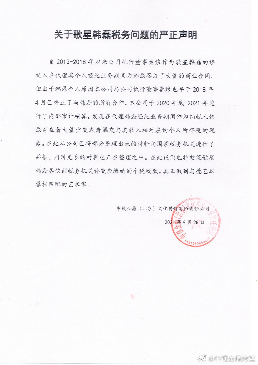 9月28日,微博認證為“中視金鼎(北京)傳媒有限責任公司”的官微@中視金鼎傳媒 發佈關於歌星韓磊税務問題的嚴正聲明。