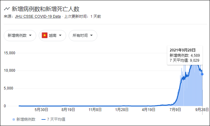 越南疫情數據圖。圖自約翰霍普金斯大學數據站