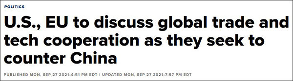 與此相對的是,CNBC、路透社等外媒均提到,美歐成立TTC是旨在共同應對來自中國的“戰略挑戰”並“牽制中國”(counter China)。