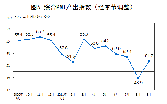 9月份,綜合PMI產出指數為51.7%,比上月上升2.8個百分點,表明我國企業生產經營活動總體較上月有所加快。