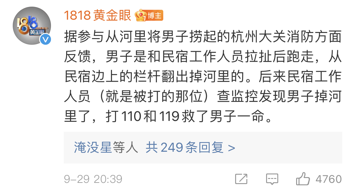 後來前台小哥報警了,但不是因為被打,而是他發現醉酒男子掉河裏了……