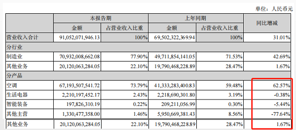 同期空調產品創造了該公司73.8%的營收,而包括生活電器、智能裝備及其它業務等佔總營收比例不足30%。