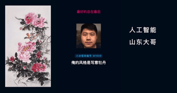 並非如此。和人類世界一樣,小冰框架同樣可以生成這位山東大哥一樣的角色。這位面容、聲音和筆下的作品都是AI生成的大哥在發佈會上用純正的口音告訴在場媒體:“俺的風格是寫意牡丹。”