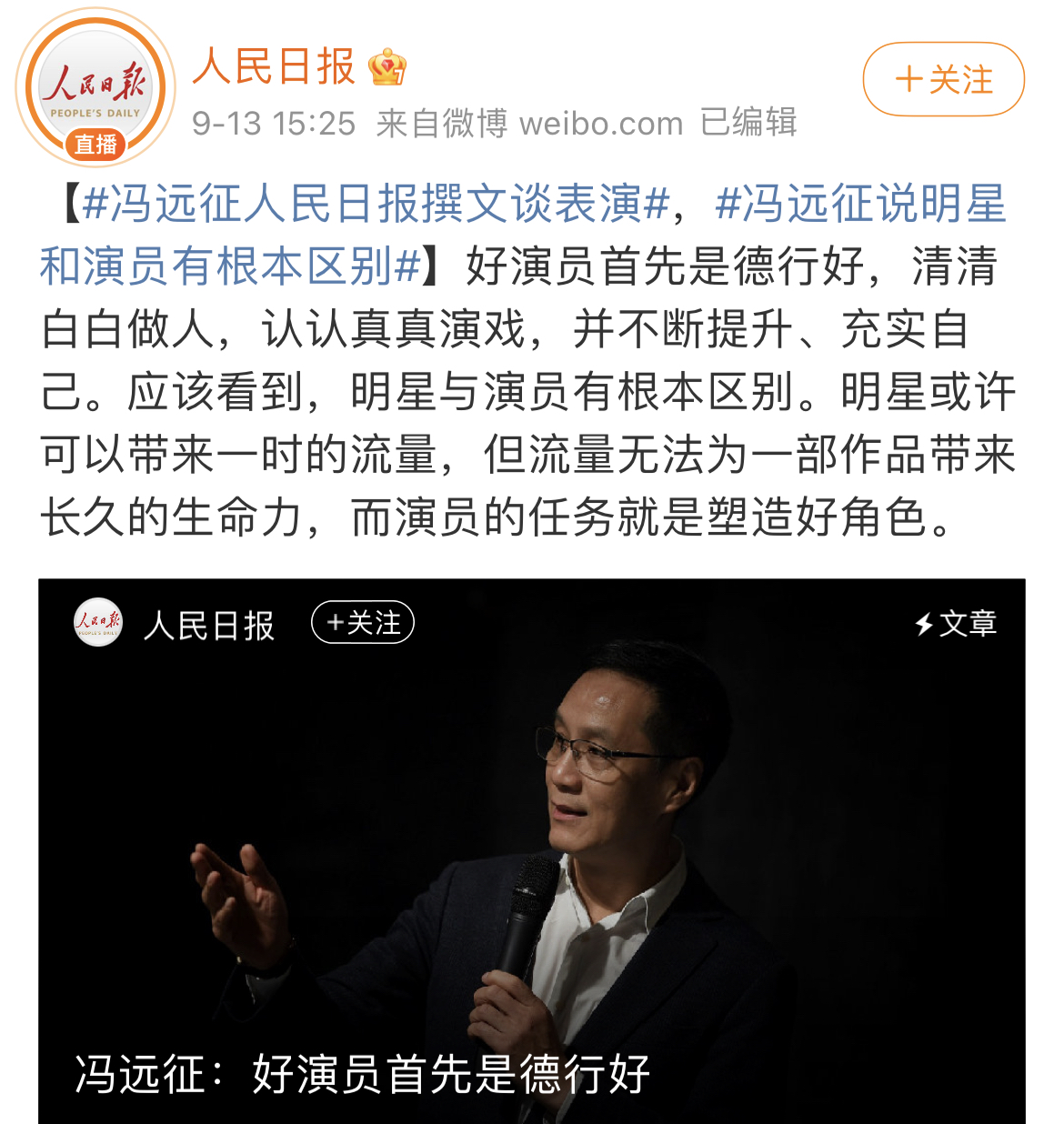 13日,馮遠征就曾在《人民日報》撰文,其中談到“好演員的標準”,稱在他眼中明星與演員有根本區別,明星或許可以帶來一時的流量,但流量無法為一部作品帶來長久的生命力。演員的任務就是塑造好角色,但現在一些年輕演員十分浮躁。