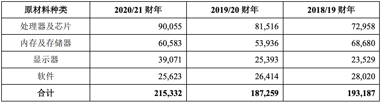 報告期內,聯想集團主要原材料採購金額分別達到1931.87億元、1872.59億元、2153.32億元,各項原材料採購金額變化趨勢與其收入變化趨勢基本相符。