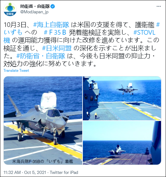 10月5日,日本防衞省消息稱,日本海上自衞隊3日在美國協助下,在“出雲”號直升機驅逐艦上實施了F-35B起降測試。目前,“出雲”號正接受改造,以具備搭載短距起飛垂直降落(STOVL)戰鬥機的作戰能力。