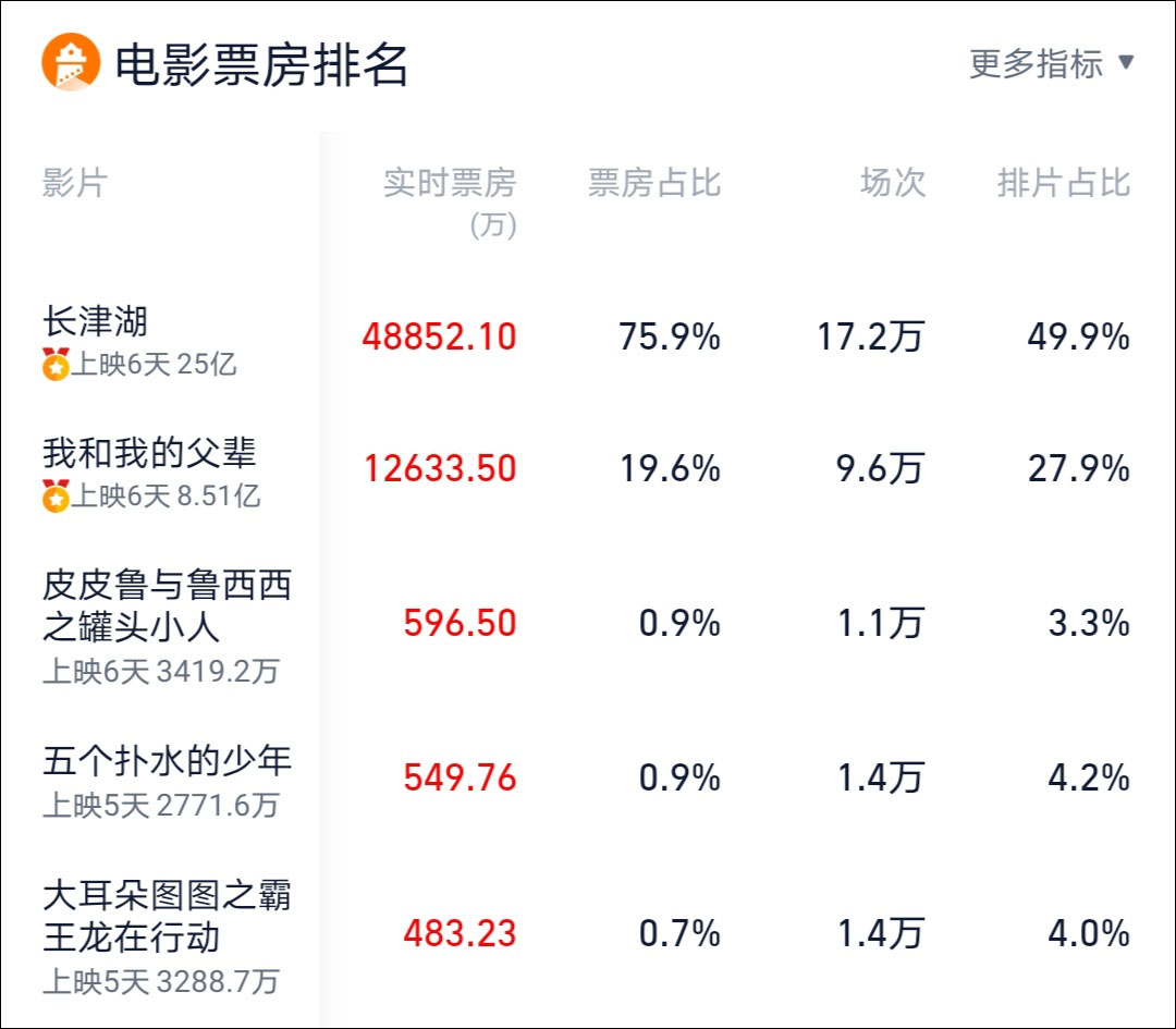 電影《長津湖》累計票房破25億 None 2021-10-05 @燈塔專業版 10月5日消息,燈塔專業版實時數據顯示,截至10月5日晚22時02分,電影《長津湖》上映6天,總票房突破25億,當前單日票房4.89億再度超越前日,持續刷新國慶檔單日票房紀錄。
