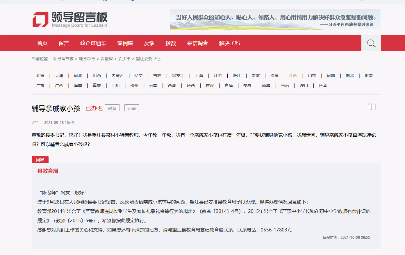 據人民網“領導留言板”10月8日消息,針對“教師輔導親戚家小孩違規嗎?”的網民留言,安徽省安慶市望江縣教育局8日回覆稱,嚴禁違規收受學生及家長禮品禮金,嚴禁有償補課。