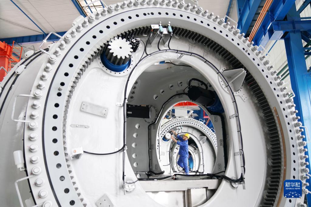 在位於黑龍江省齊齊哈爾市的中國一重集團有限公司風電裝備生產製造廠生產車間,工人在進行生產作業(7月1日攝)。新華社記者 王建威 攝