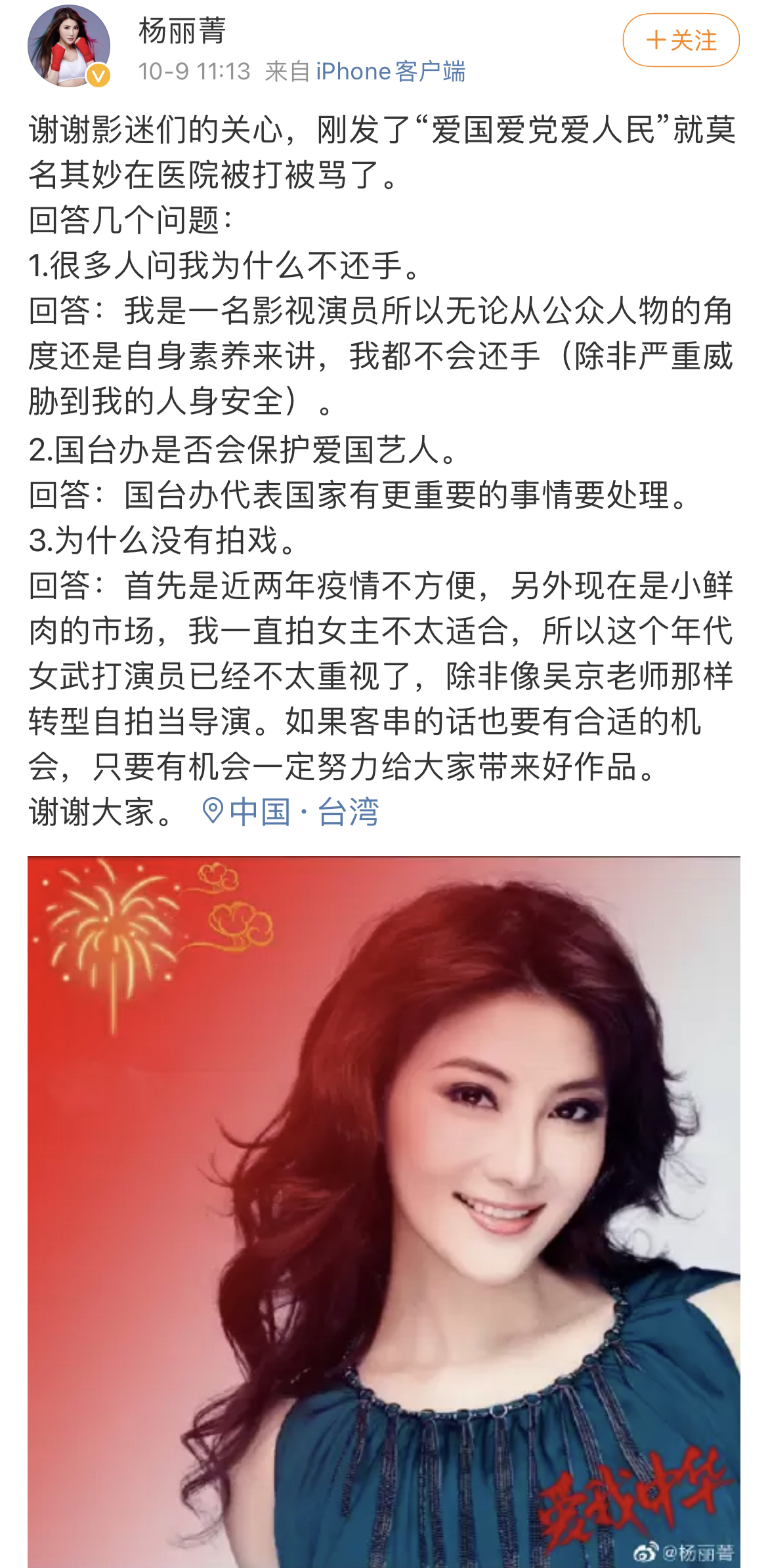 今天(9日)中午,@楊麗菁 在微博回應粉絲關心,稱自己“剛發了‘愛國愛黨愛人民’就莫名其妙在醫院被打被罵”,沒有還手是出於公眾人員和自身素養角度考慮。被問及“國台辦是否會保護愛國藝人”,楊麗菁表示“國台辦代表國家有更重要的事情要處理”。