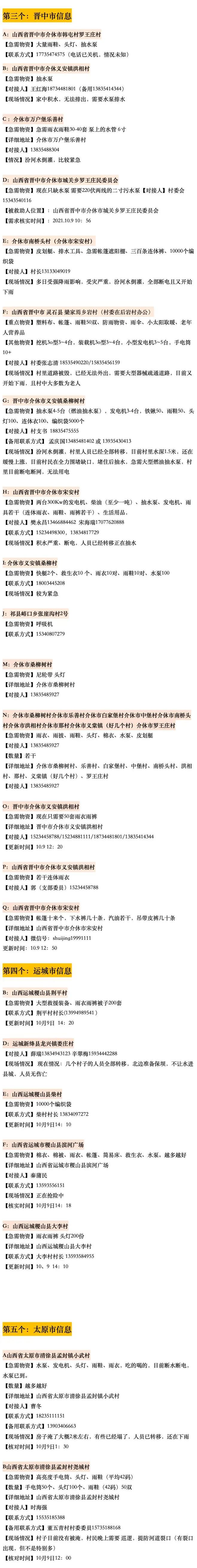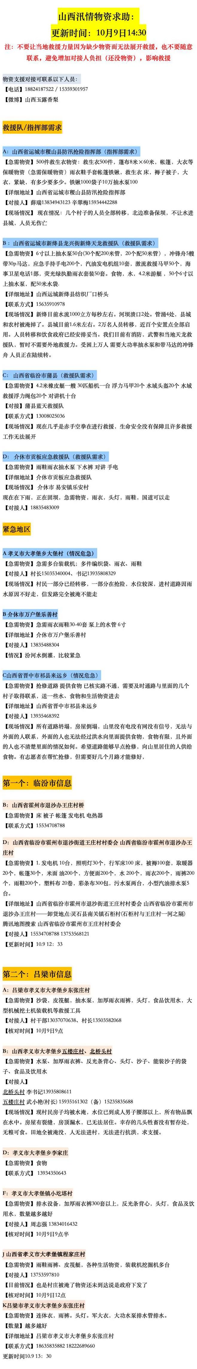 “人民日報”微信公眾號9日消息,山西暴雨牽掛着全國人民的心,根據山西防災服務枱志願者核實,截至9日14點30分,現急需救援物資彙總如下: