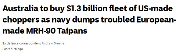 澳大利亞廣播公司(ABC)9日稱,此舉意味着澳海軍將以此替換因“出現問題”而停飛的歐洲造MRH90直升機,而這引發澳大利亞國內的不滿。有澳大利亞政客批評道,此前為了購買“有問題”的歐洲直升機,“澳政府曾花費巨資”,然而事到如今卻又要“浪費納税人的錢”。