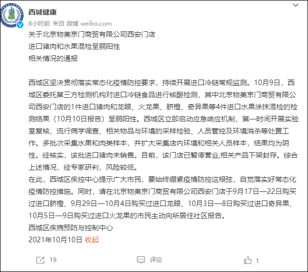 據微博“西城健康”10月10日消息,西城區堅決貫徹落實常態化疫情防控要求,持續開展進口冷鏈常規監測。10月9日,西城區委託第三方檢測機構對進口冷鏈食品進行核酸檢測,其中北京物美京門商貿有限公司西安門店的1件進口豬肉和龍眼、火龍果、臍橙、奇異果等4件進口水果塗抹混檢的檢測結果(10月10日報告)呈弱陽性。西城區立即啓動應急響應機制,第一時間開展實驗室複核、流行病學調查、相關物品與環境的採樣檢驗、人員管控及環境消殺等處置工作。多批次採集水果和肉類樣本,並擴大采集店內環境和相關人員樣本,結果均為陰性。經核實,該批進口豬肉未銷售。目前,該門店已暫停營業,相關產品下架封存。綜合上述情況,經專家研判,風險較低。