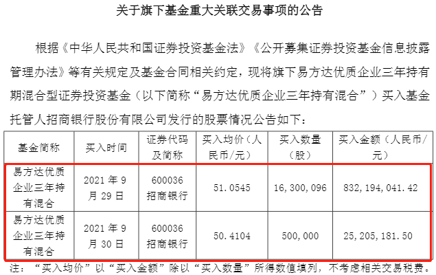 需要指出的是,招商銀行是易方達優質企業三年持有混合基金的託管行,根據公募基金相關法規,基金管理人運用基金財產買賣基金託管人等發行的證券或承銷期內承銷的證券,或者從事其他重大相關聯交易事項,需要及時披露相關情況。