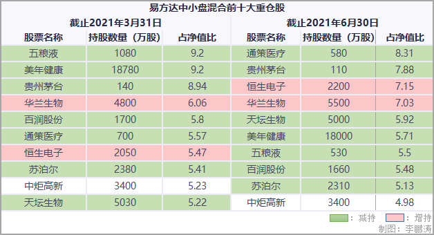 具體來看,通策醫療在被減持120萬股後,仍躍居第一大重倉股;五糧液被大幅減持了550萬股,貴州茅台也被小幅減持了30萬股,這兩隻個股已連續兩個季度被易方達中小盤減持。