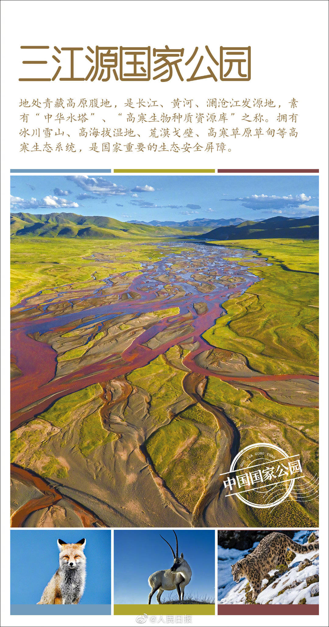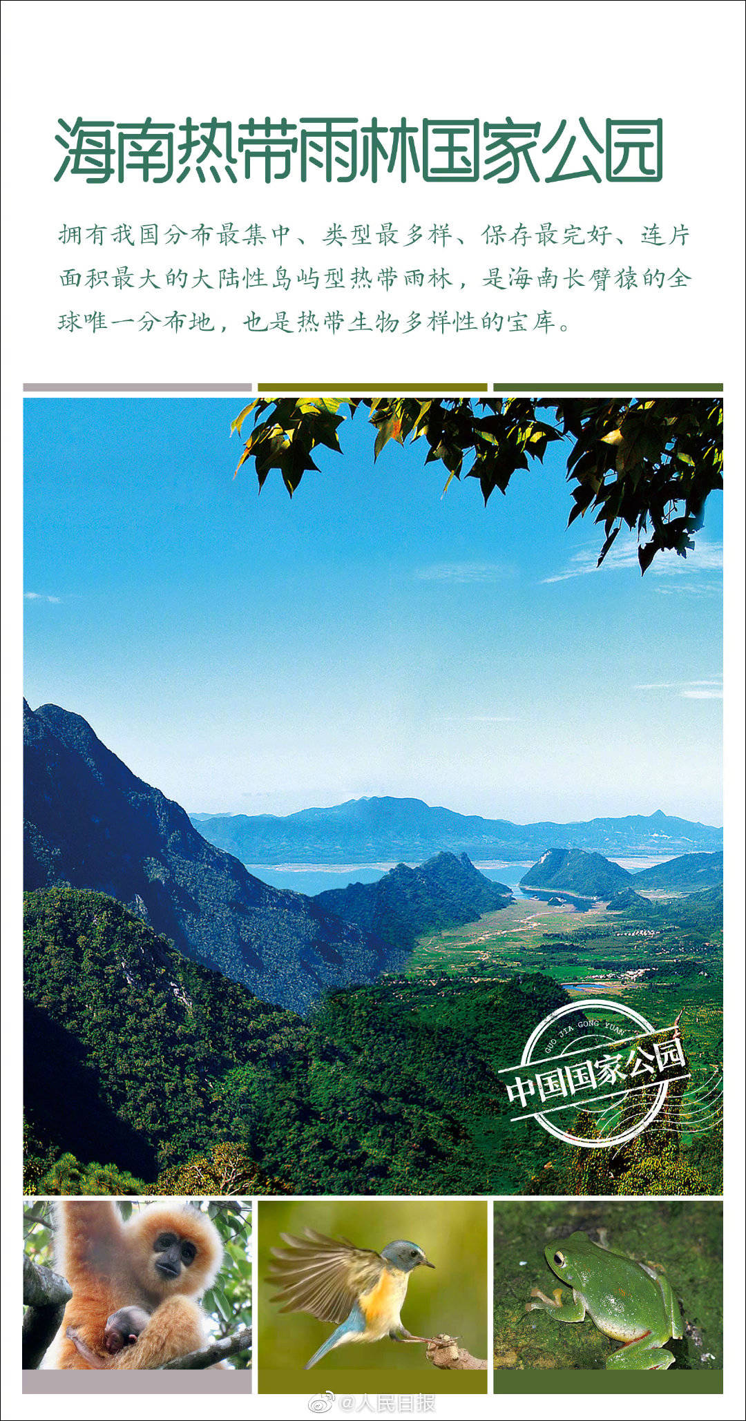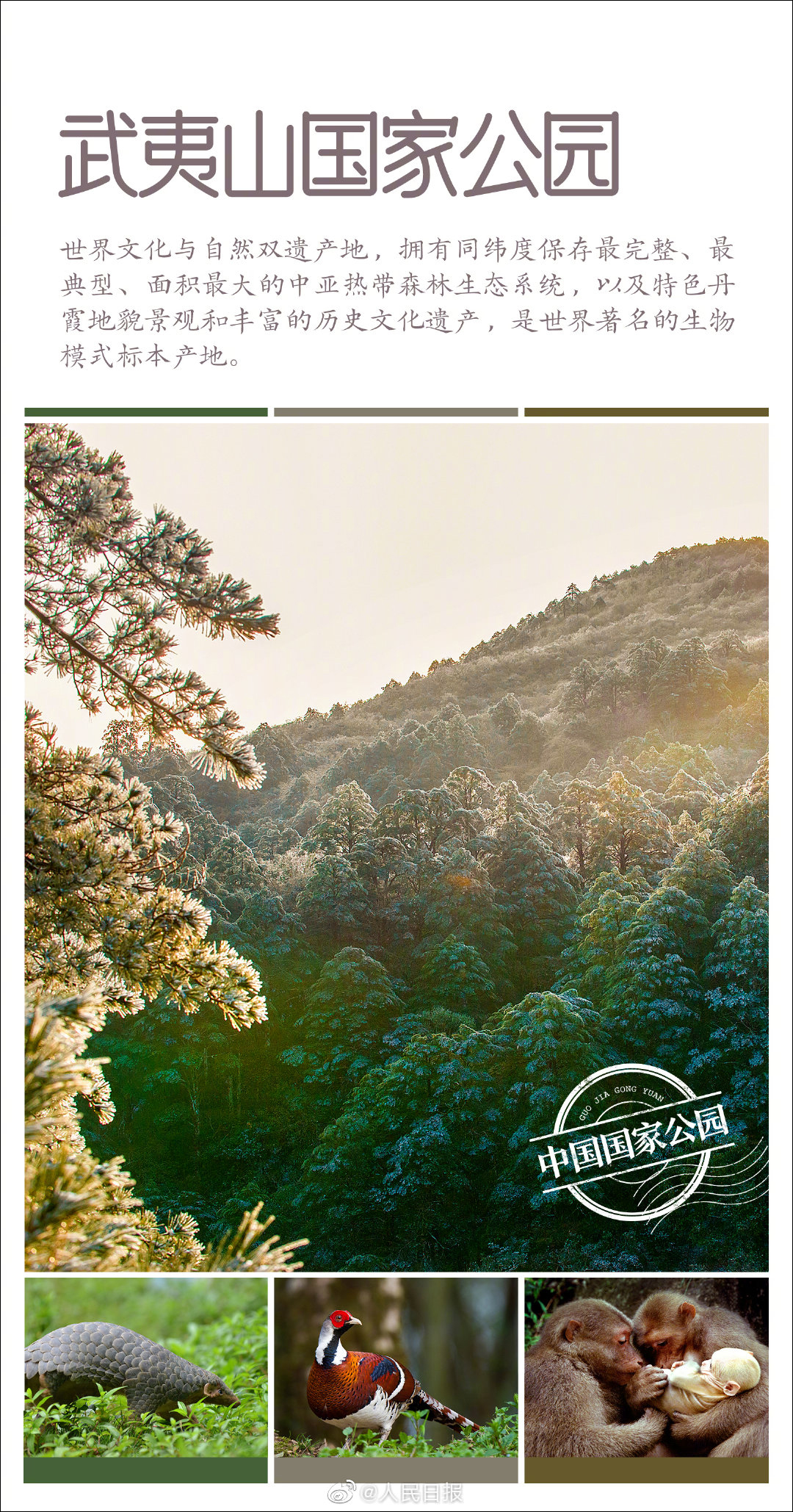 第一批國家公園名單公佈 None 2021-10-12 @人民日報 10月12日消息,第一批國家公園名單公佈。 國家公園由國家確立並主導管理,是我國生態文明制度建設的重要內容。首批名單:三江源國家公園、大熊貓國家公園、東北虎豹國家公園、海南熱帶雨林國家公園、武夷山國家公園。