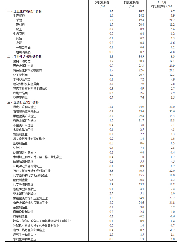 9月份,受煤炭和部分高耗能行業產品價格上漲等因素影響,工業品價格漲幅繼續擴大。